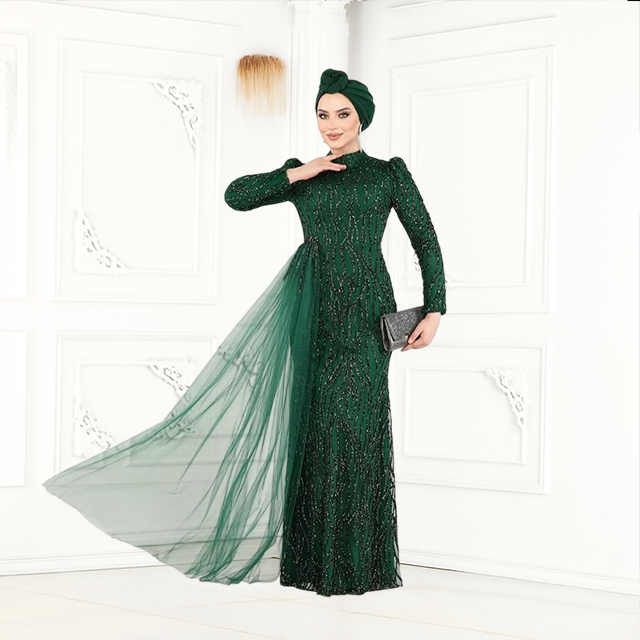 Zümrüt rengin zarafetini taşıyan Elvânur Abiye, modern davetlerin gözdesi olacak.